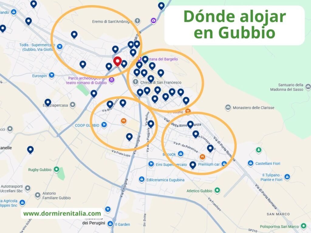 La mejor zona para alojarse en Gubbio es el centro histórico, cerca de las principales atracciones y restaurantes. También puedes encontrar alojamientos con encanto en las afueras de la ciudad.