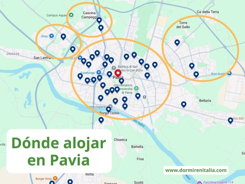 Áreas recomendadas para dormir en la ciudad de Pavia.
